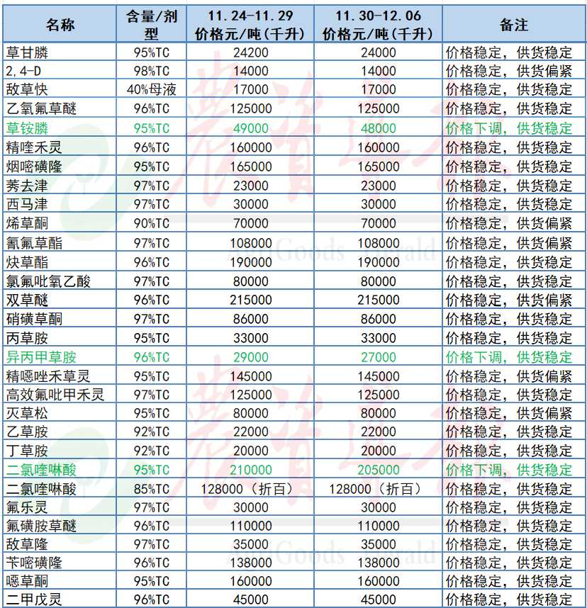 95%草铵膦原药价格下跌1,000元,至48,000元/吨;96%异丙甲草胺原药下跌2,000元,至27,000元/吨;95%二氯喹啉酸原药下跌5,000元,至205,000元/吨。