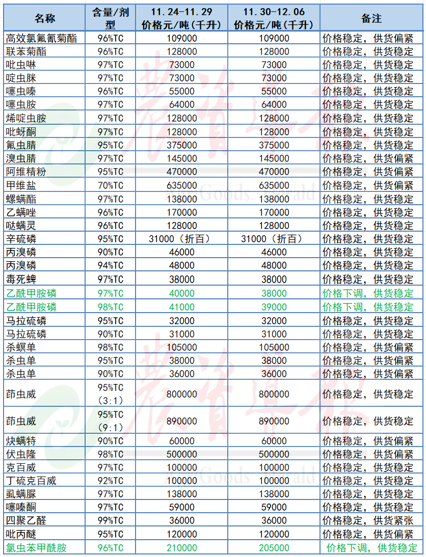 97%乙酰甲胺磷原药价格下跌2,000元,至38,000元/吨;98%乙酰甲胺磷原药下跌2,000元,至39,000元/吨;96%氯虫苯甲酰胺原药下跌5,000元,至205,000元/吨。