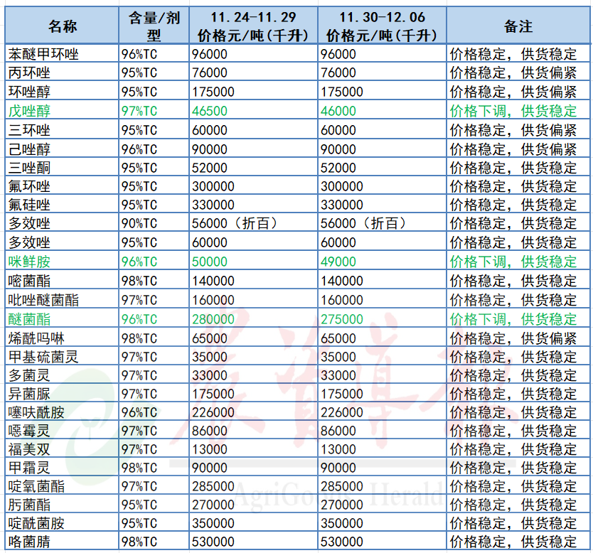 97%戊唑醇原药价格下跌500元,至46,000元/吨;96%咪鲜胺原药下跌1,000元,至49,000元/吨;96%醚菌酯原药下跌5,000元,至275,000元/吨。
